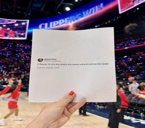 值得留意的是,此前有球迷在個(gè)人社交媒體聲稱,若快船能在本賽季任意階段獲得15勝3負(fù)的戰(zhàn)績(jī),他會(huì)將這條推文打印出來吃掉。而在本場(chǎng)比賽結(jié)束后,這名球迷也在第一時(shí)間發(fā)推表示,自己將會(huì)直播履行承諾。