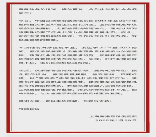 29日,上海海港足球俱樂部發(fā)布公告道歉:堅(jiān)決擁護(hù)、全面接受處罰決定。