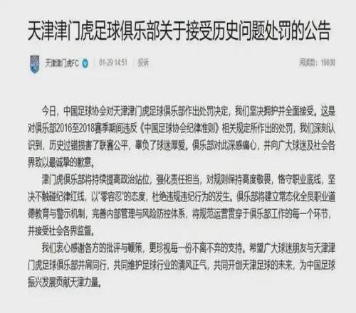29日,天津津門虎足球俱樂部發(fā)布公告回應(yīng)處罰:堅(jiān)決擁護(hù)并全面接受,向球迷及各界致以最誠摯的歉意。