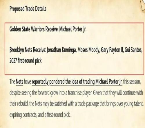 美媒《Fadeaway World》更是提出了一套5換1的交易方案,建議勇士打包送出穆迪、庫明加、桑托斯、小佩頓以及2027年的首輪簽,從籃網引入小波特。
