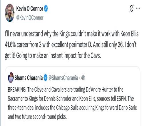 相比于身背大合同的亨特,埃利斯是廉價至極的優(yōu)質(zhì)3D球員,正如美記奧康納所說,26歲的埃利斯防守數(shù)據(jù)聯(lián)盟頂尖,生涯三分命中率41.6%,很難理解為何國王不能與他愉快合作,他的加入將立即為騎士帶來顯著的影響。