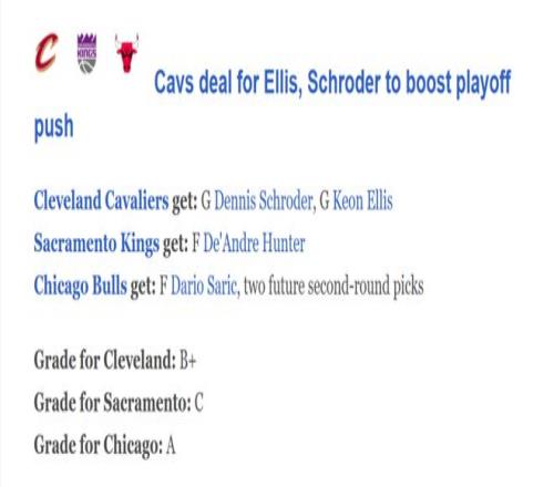 針對這一筆3方交易,權(quán)威美媒ESPN也火速給出交易評分,其中第三方公牛成為大贏家,騎士也拿下B+高評分,反而是國王壓著及格線僅獲C。