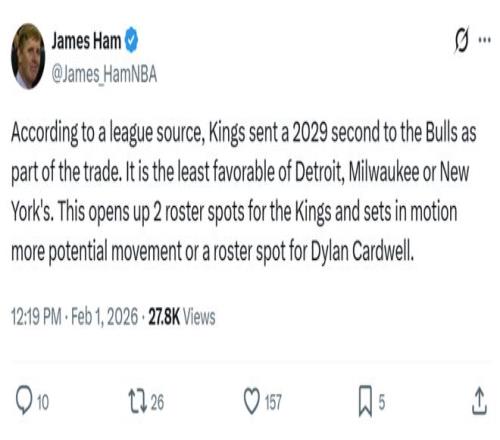 整個交易中公牛隊僅吃下薩里奇的合同,就拿到了兩枚次輪簽回報,哪怕國王隊記James Ham后續(xù)跟進指出,國王送走的29年次輪簽是活塞、雄鹿和尼克斯三個次輪中順位最低的一個也依舊無法改變這一點。