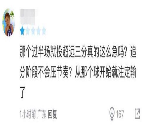 此前胡明軒在低迷的時(shí)候,因?yàn)楣室獍驯荣惞?jié)奏放緩而飽受詬病,最近他好不容易跟上球隊(duì)的快節(jié)奏,但在本場(chǎng)對(duì)陣寧波需要降速、壓節(jié)奏時(shí),胡明軒反倒是一個(gè)勁地沖,在球隊(duì)落后5分的情況下,他那記超遠(yuǎn)三分打鐵,也為球隊(duì)最后的失利埋下伏筆。