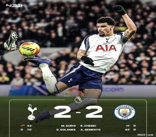 曼城客場(chǎng)2-2戰(zhàn)平熱刺,6輪僅1勝積47分位居第2,距榜首阿森納6分。熱刺聯(lián)賽6輪不勝,積29分名列第14。謝爾基首開(kāi)紀(jì)錄,塞梅尼奧擴(kuò)大比分,哈蘭德和B席助攻,索蘭克雙響+蝎子擺尾扳平。