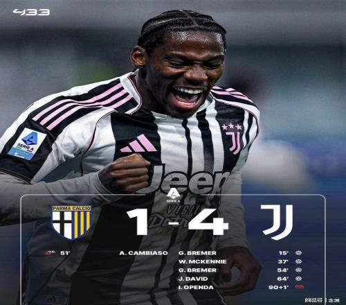 尤文圖斯客場(chǎng)4-1擊敗帕爾馬,2分優(yōu)勢(shì)超越少賽一場(chǎng)的羅馬升至第4位。布雷默、麥肯尼先后破門(mén),孔塞桑射中橫梁,坎比亞索自擺烏龍,布雷默、戴維下半場(chǎng)幫助尤文鎖定勝局。