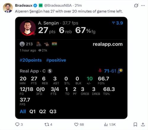 第三節(jié)開場申京20分鐘已經(jīng)拿到27分了,步行者開始各種包夾申京了,三節(jié)打完申京21中13,拿到31分9籃板3助攻了。申京三節(jié)31分也是生涯首次,只可惜火箭就申京一個點(diǎn),步行者已經(jīng)將比分扳平。