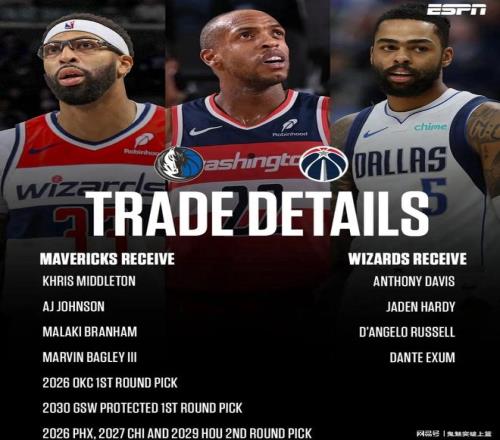 雙方達(dá)成的具體交易為:獨(dú)行俠送出安東尼戴維斯+杰登哈迪+德安吉洛拉塞爾+丹特??怂_姆,從奇才換回克里斯米德爾頓+AJ約翰遜+馬拉凱布蘭納姆+馬文巴格利+2026年首輪簽(來自雷霆)+2030年受保護(hù)首輪簽(來自勇士)+2026年次輪簽(來自太陽)+2027年(來自公牛)+2029年次輪簽(來自火箭)。
