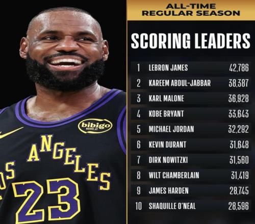 把視角拉回榜首,詹姆斯以42,786分排在第1,賈巴爾以38,387分排在第2,兩者差距達(dá)到4,399分。