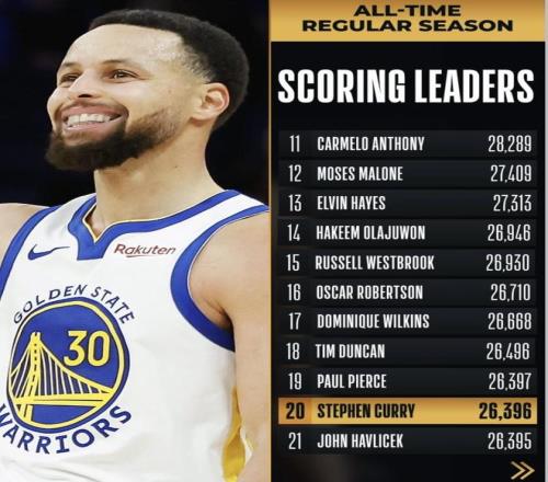 更關(guān)鍵的是“下一格”已經(jīng)擺在眼前:第18位是鄧肯26,496分,庫(kù)里與這格的差距只剩99分。