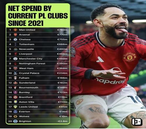 2021年來(lái)現(xiàn)有英超俱樂(lè)部的轉(zhuǎn)會(huì)凈支出榜單出爐!曼聯(lián)妥妥冤大頭