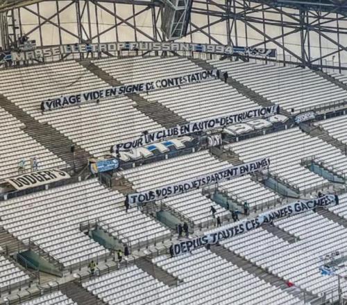 此外本場(chǎng)比賽還遭到了馬賽球迷的空?qǐng)觯ú糠挚磁_(tái))抗議,球迷橫幅上寫道:“空空如也的看臺(tái)以示抗議,對(duì)于一個(gè)自我毀滅的俱樂部而言,你們所有的計(jì)劃都在這些荒廢的歲月中化為泡影”。