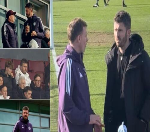球員間爆發(fā)混戰(zhàn),裁判瘋狂吹哨,兩張紅牌出示。周六下午,邁克爾-卡里克就站在家長群中,目睹了這一切??ɡ锟爽F(xiàn)身曼城青訓(xùn)學(xué)院,觀看兒子參加的U16曼市德比。他身著黑色運動套裝、黑色外套,佩戴墨鏡。