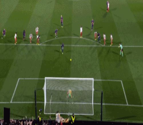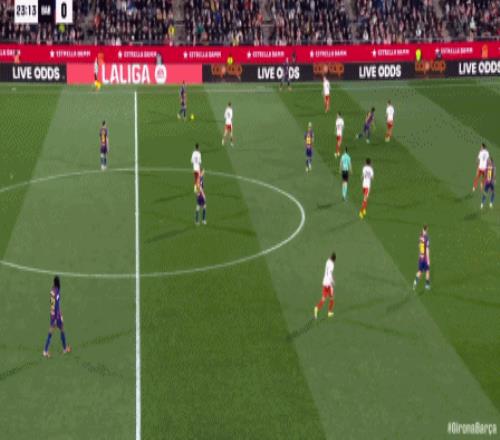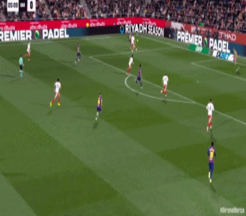 第34分鐘,拉菲尼亞直塞,費爾明小角度打門踢飛
