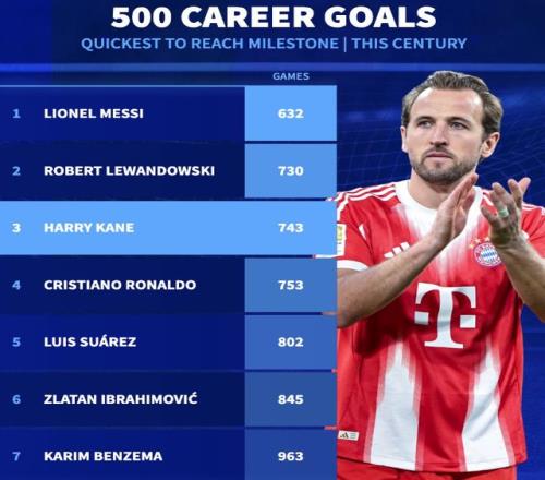 凱恩的500球,用了743場比賽。凱恩的500球分布如下:熱刺280球,拜仁126球,英格蘭78球,米爾沃爾9球,萊頓東方5球,萊斯特城2球。