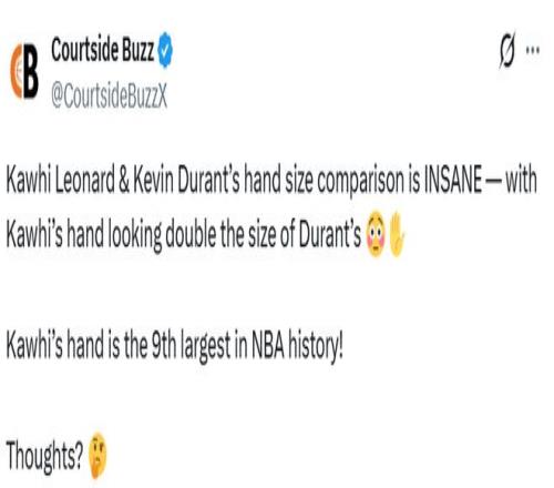 北京時間2月17日,美媒Courtside Buzz曬出了一張全明星賽的擊掌圖,并配文寫道:“科懷-萊昂納德和凱文-杜蘭特的手掌大小對比簡直太驚人了——科懷的手看起來是杜蘭特手掌的兩倍大??茟训氖质荖BA歷史上第九大的手!有什么想法?”
