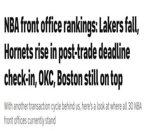 美媒公布NBA高管排名:雷霆居首火箭第3勇士第17湖人第25
